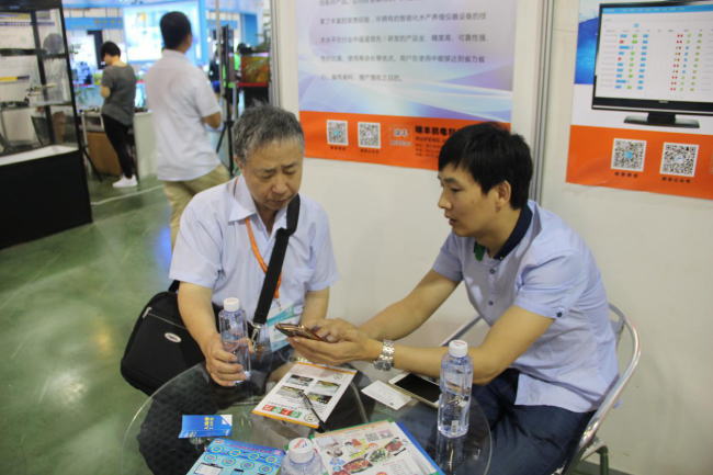 圖右:瑞豐水產科技劉鳳彥在給參展人員介紹溶氧儀物聯網APP